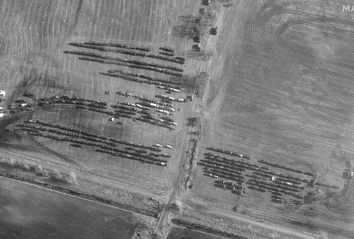 تصاویر ماهواره ای که روز جمعه (روز گذشته) انتشار یافت از حضور گسترده قوای نظامی و همچنین ۱۵۰ فروند بالگرد ترابری در جنوب بلاروس و در فاصله ۲۰ مایلی از مرز با اوکراین دیده می شود.