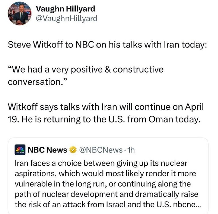 بر اساس اعلام این رسانه، این خبرنگار به نقل از نماینده ویژه ترامپ اضافه کرد که مذاکرات با ایران در ۱۹ آوریل ادامه خواهد یافت. او امروز از عمان به ایالات متحده بازمیگردد.